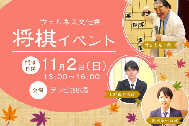 神吉宏充七段による愉快なトークショー、上野裕寿五段、徳田拳士四段による目隠し対局、他にも将棋クイズや ・・・