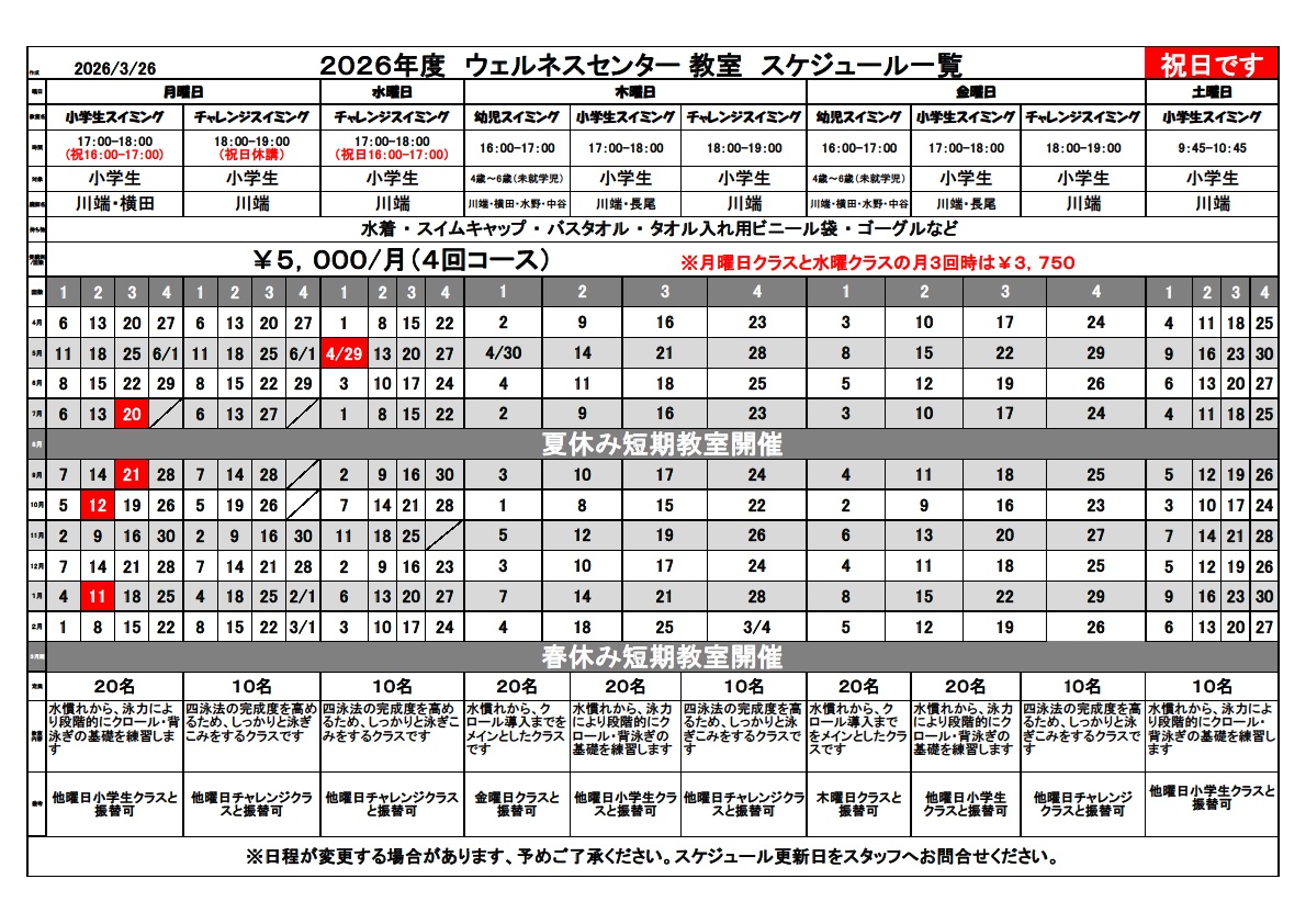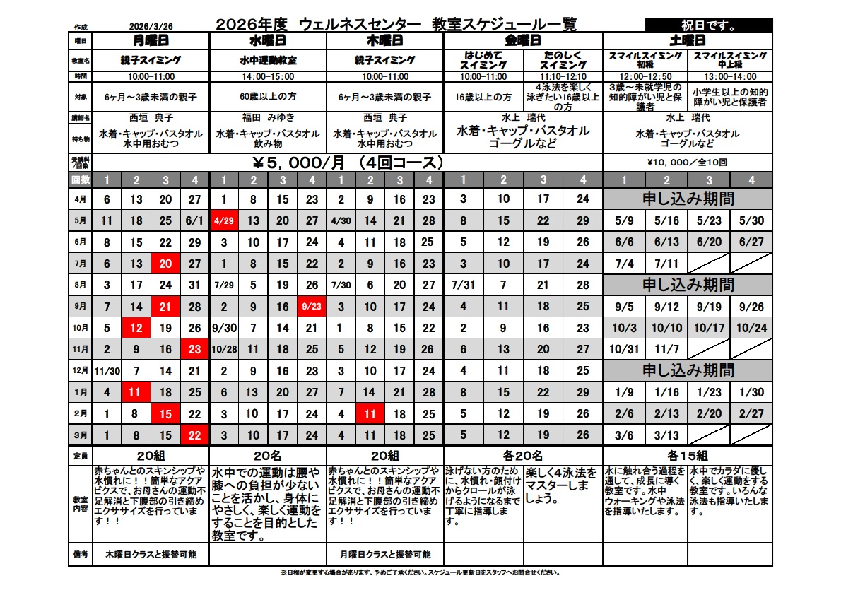 お渡しできていなかったプールのカルチャー教室の年間スケジュールをお伝えいたします。