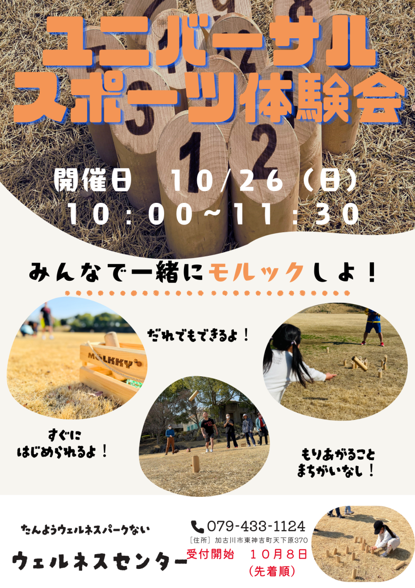 ユニバーサルスポーツ体験会のご案内 2025/10/09 いつもウェルネスセンターのHPをご覧いただき誠にありがとうございます 今回はユニバーサルスポーツ体験会として話題のモルックを開催いたします ウェルネスセンターでは定期的にモルック体験をしておりますので この機会にぜひ一度ご体験ください 詳細は下記内容をご確認ください 皆様のご参加をお待ちしております