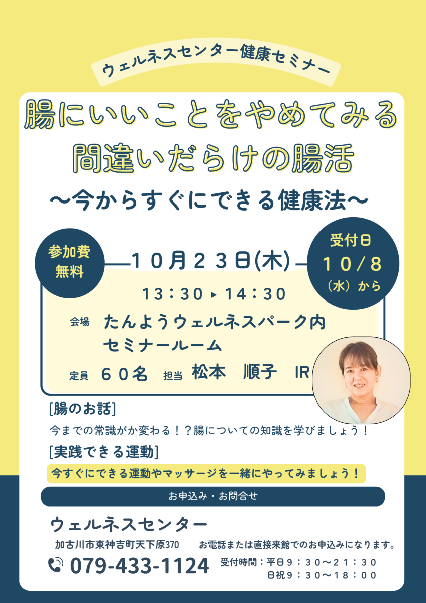 健康セミナーのご案内 『腸にいいことやめてみる 間違いだらけの腸活』 2025/10/09 いつもウェルネスセンターのHPをご覧いただき誠にありがとうございます すでに加古川市の広報10月号に掲載中の健康セミナーのご案内です 詳細は下記内容をご確認ください 皆様のご参加お待ちしております