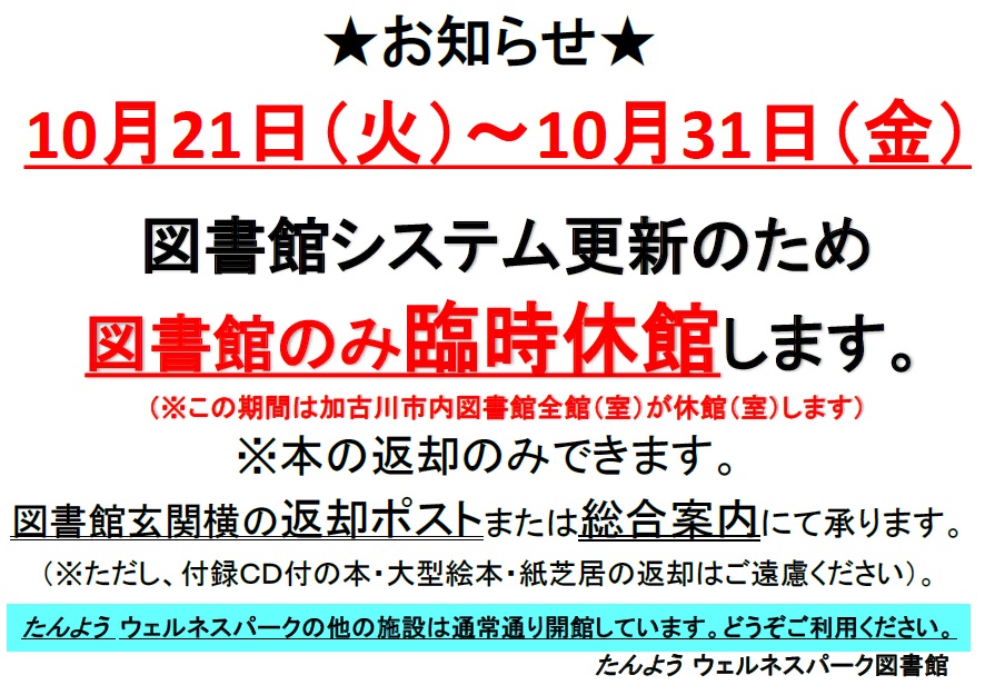 図書館システム更新に伴う臨時休館のお知らせ(10月21日から10月31日まで)