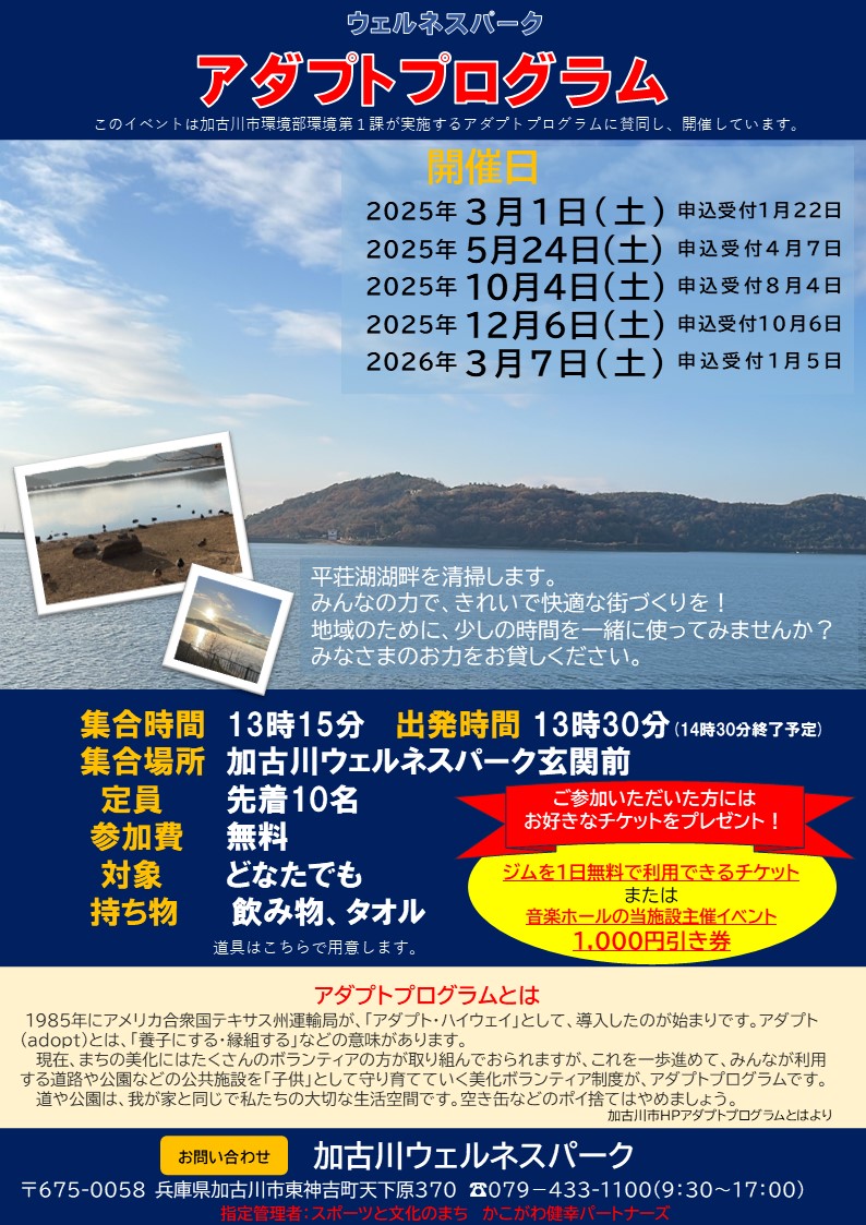 【お知らせ】本日開催予定のアダプトプログラムについて 2025/10/04 本日予定しておりましたアダプトプログラムは、雨天のため中止となりました。 ご参加を予定されていた皆さまにはご迷惑をおかけいたしますが、ご理解のほどよろしくお願いいたします。 次回のアダプトプログラムは、12月6日(土)に開催予定です。 参加受付は、10月6日(月)より開始いたします。 皆さまのご参加を心よりお待ちしております。