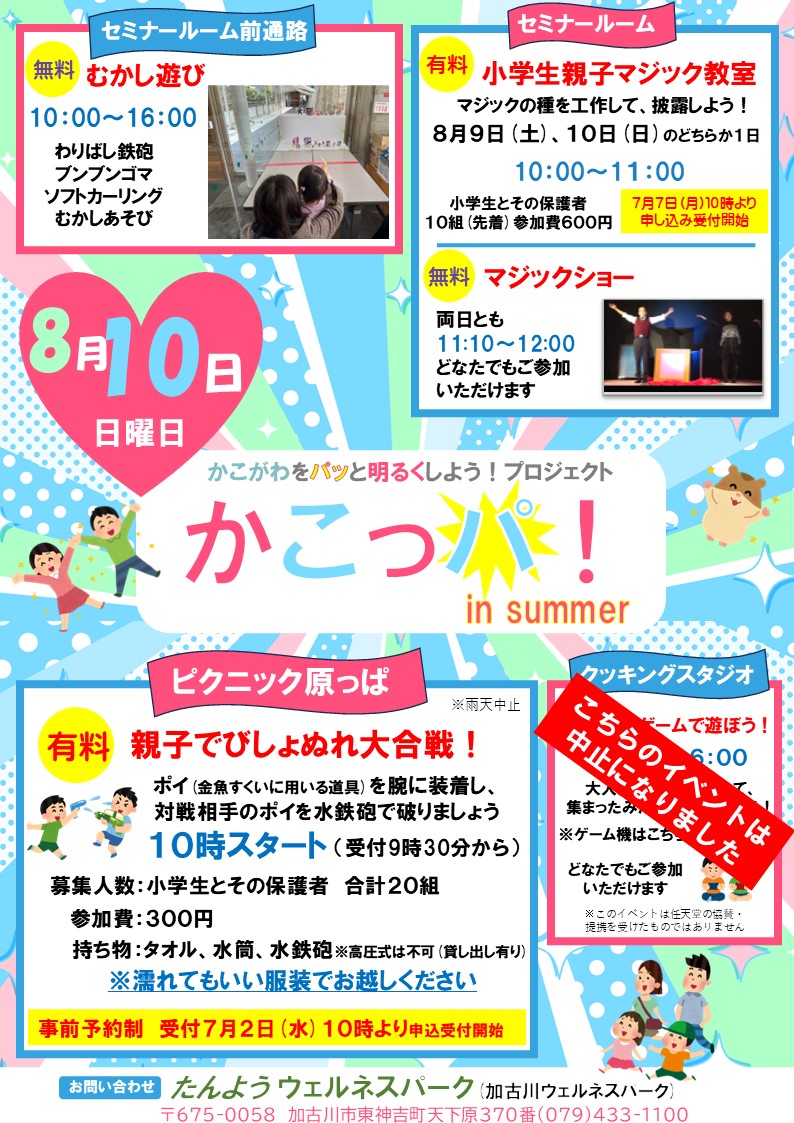 かこっパ! 2025/07/19 かこっパ!in summer~かこがわをパッと明るくしよう!プロジェクト~ 3月に開催された【かこっパ!】第2弾! 今回は夏にぴったり、ピクニック原っぱで『親子でびしょぬれ大合戦!』 水鉄砲で相手のポイを打ち破れ! 前回好評だった「むかし遊び」「小学生親子マジック教室」や「マジックショー」も ありますよ!8月10日はたんようウェルネスパークにあつまれ~!