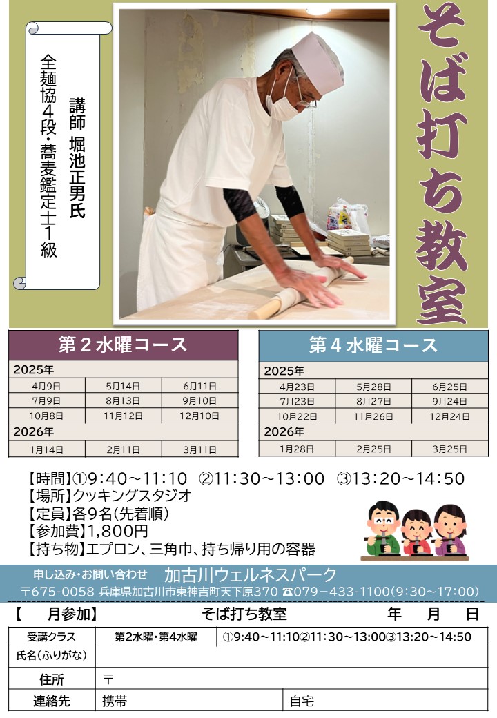 たんようウェルネスパークでは、そば打ちの基本から本格的な技まで学べる「そば打ち教室」を開催しています。講師は、全麺協四段・蕎麦鑑定士一級の堀池正男氏。初心者の方も安心して参加できる内容です。