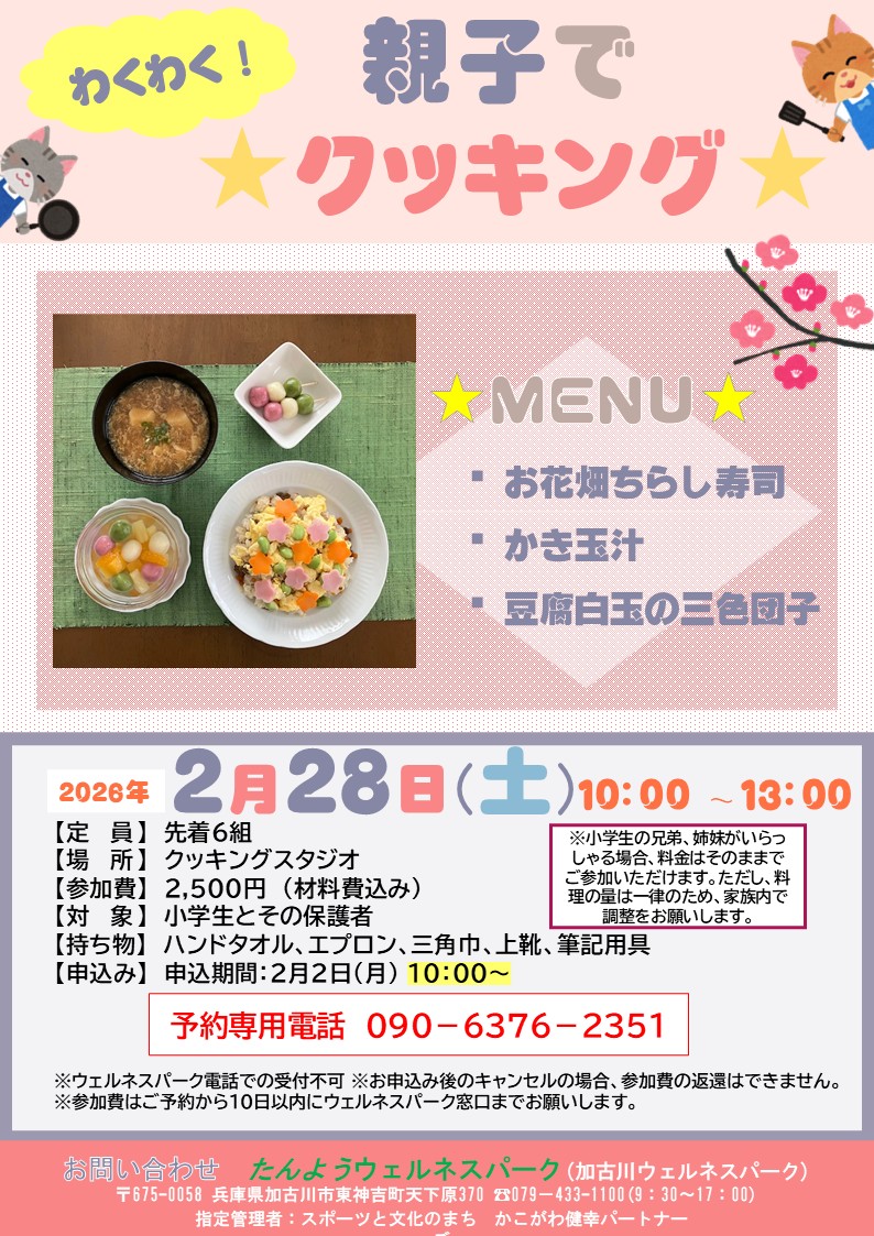 わくわく!親子でクッキング★ 2025/11/29 春を感じる彩りメニューで、親子一緒に楽しくクッキング! 2月28日(土)、クッキングスタジオで「わくわく!親子でクッキング」を開催します。 今回のテーマは、ひな祭りにぴったりの華やかな和食メニュー。 お花畑ちらし寿司やかき玉汁、そして見た目もかわいい豆腐白玉の三色団子を親子で一緒に作りましょう。料理初心者でも安心して参加できる内容です。 定員は先着6組、申込は2月2日(月)10:00からスタート! 春の訪れを感じる楽しい時間を、ぜひ親子で体験してください。