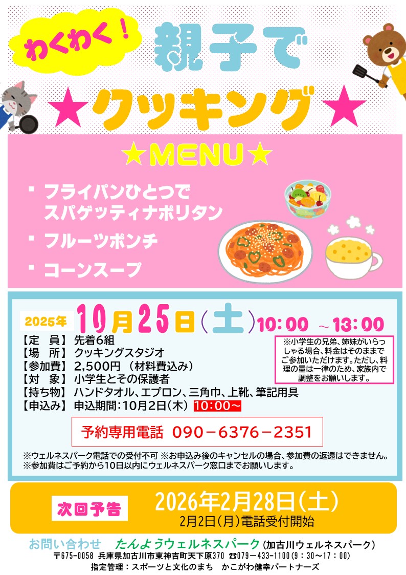 わくわく!親子でクッキング★ 2025/10/19 親子で一緒に料理を楽しみながら、食の大切さや協力する喜びを体験してみませんか? このイベントでは、簡単で美味しいメニューを親子で協力して作ります。 完成した料理はみんなで試食タイム♪ 笑顔あふれるキッチンで、親子の絆を深めましょう! お申し込み 10月2日(木)10:00~