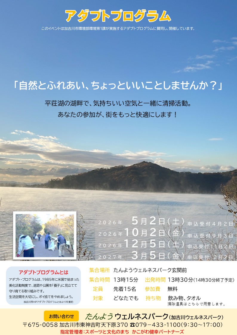 アダプトプログラム 2026/04/25 2026年5月2日(土)開催アダプトプログラム参加者募集中! 平荘湖湖畔を清掃します。 みんなの力で、きれいで快適な街づくりを! 地域のために、少しの時間を一緒に使ってみませんか? みなさまのお力をお貸しください。