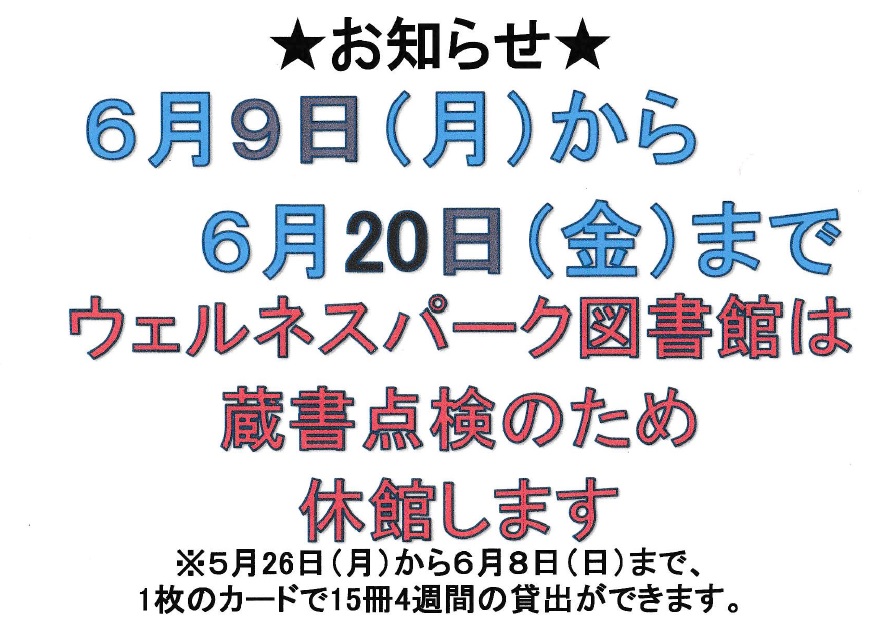 ウェルネスパーク図書館の休館(6月9日から6月20日)のお知らせ 2025/05/25 ウェルネスパーク図書館は資料整理のため6月9日(月曜)から6月20日(金曜)の間、休館いたします。 休館にともない、下記の期間は貸出冊数と貸出期間を変更します。 適用期間 5月26日(月曜)から6 月8日(日曜) 貸出冊数 15冊 貸出期間 4週間