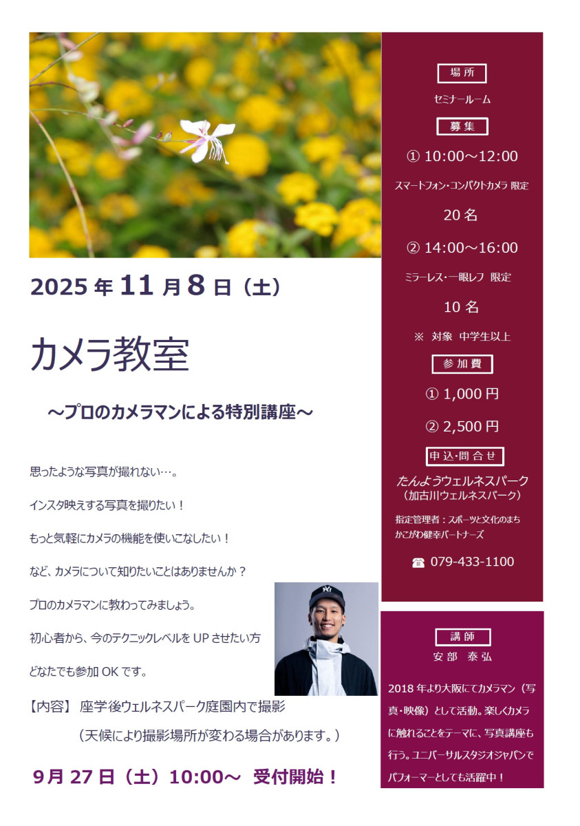 カメラ教室~プロのカメラマンによる特別講座~ 2025/11/01 2025年11月8日(土)、プロのカメラマンによる特別講座「カメラ教室」を開催します! 「思ったような写真が撮れない」「もっと素敵な写真を撮りたい」という方におすすめの講座です。 スマートフォンや一眼レフを使って、写真の基本からワンランク上のテクニックまで丁寧に学べます。 開催時間・定員 午前の部(10:00~12:00):スマートフォン・コンパクトカメラ限定/20名 午後の部(14:00~16:00):デジタル一眼レフ限定/10名 対象:中学生以上 参加費:①1,000円(午前)②2,500円(午後) 会場:たんようウェルネスパーク(加古川ウェルネスパーク) ※天候により撮影場所が変わる場合があります。 受付開始は 9月27日(日)10:00~。 プロの指導で、あなたの写真がもっと魅力的に!ぜひご参加ください。 お問い合わせ:079-433-1100