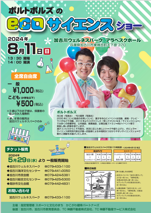 ボルトボルズのecoサイエンスショー 2024/05/23 ボルトボルズの ecoサイエンスショー 笑いと驚き! こんなサイエンスショー見たことがない! 唯一無二の爆笑サイエンスショー! 身近にあるものを使った、あっと驚き笑える科学実験の数々をお楽しみください!