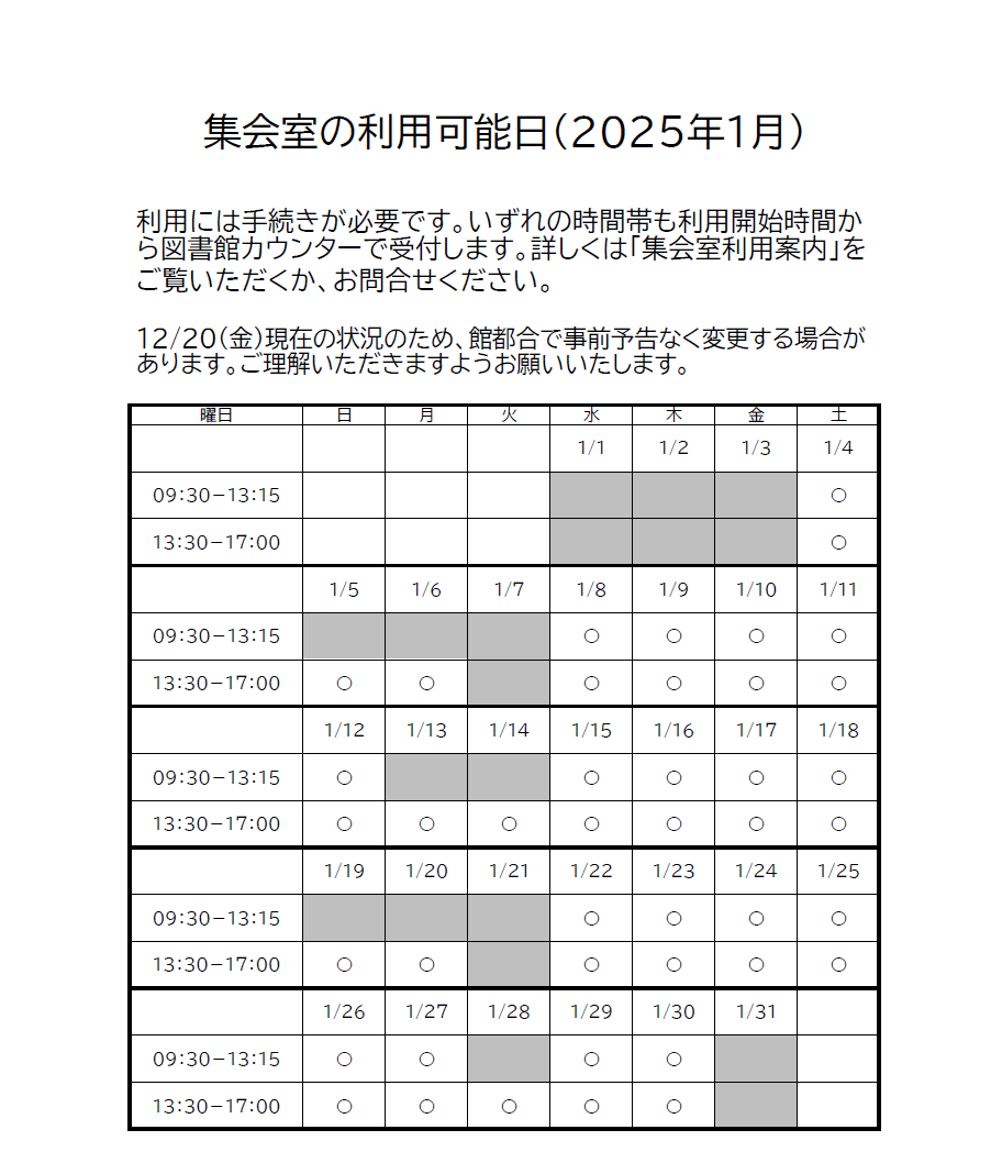 1月の集会室開放について(図書館) 2024/12/22 図書館2階の集会室を開放しています。 読書や自習等にご利用ください。 利用には図書館カウンターでの手続きが必要です。 詳しくは図書館窓口までお問い合せください。