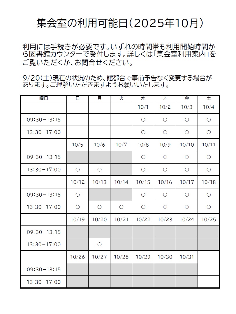 10月の集会室開放について 2025/09/20 図書館2階の集会室を開放しています。読書や自習等にご利用ください。利用には図書館カウンターでの手続きが必要です。詳しくは図書館窓口までお問い合せください。