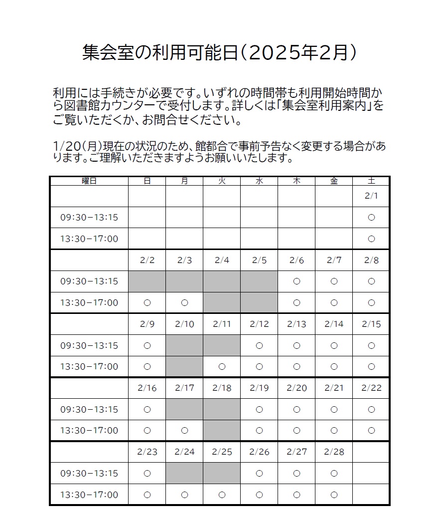 2月の集会室開放について(図書館) 2025/01/21 図書館2階の集会室を開放しています。 読書や自習等にご利用ください。 利用には図書館カウンターでの手続きが必要です。 詳しくは図書館窓口までお問い合せください。