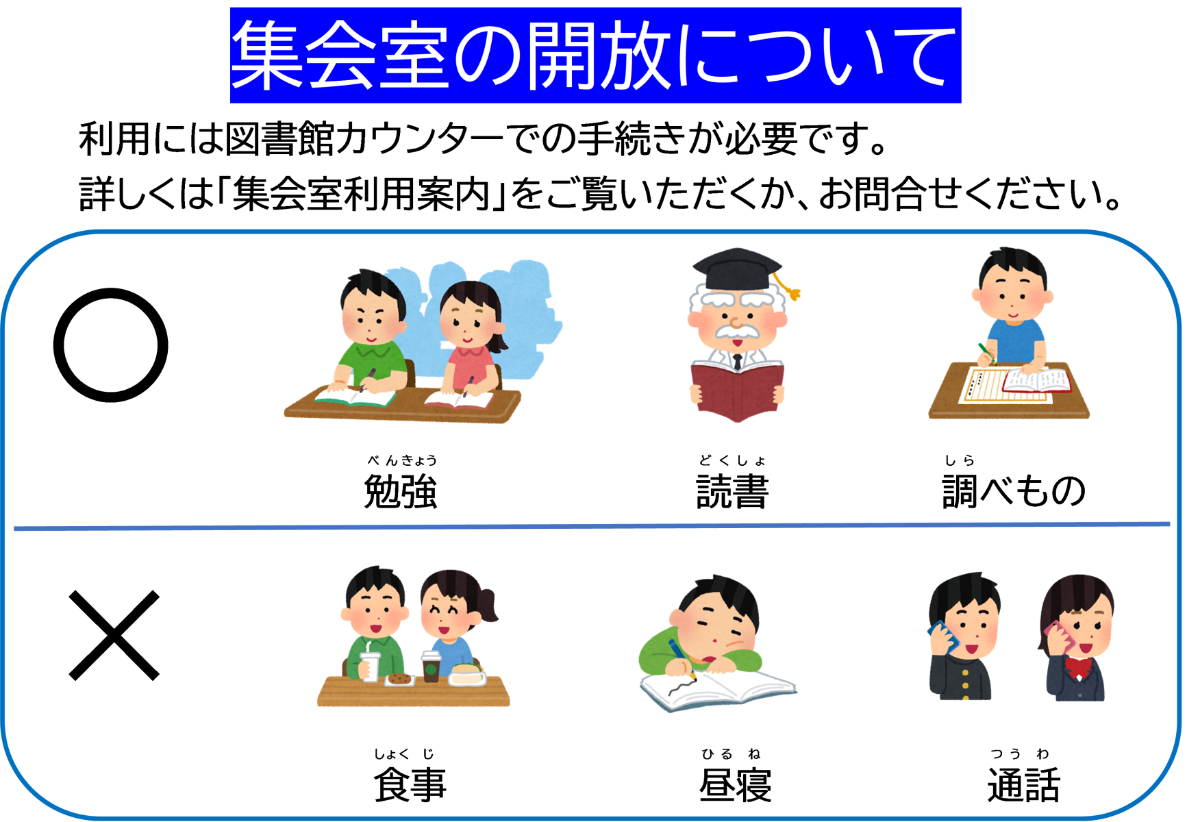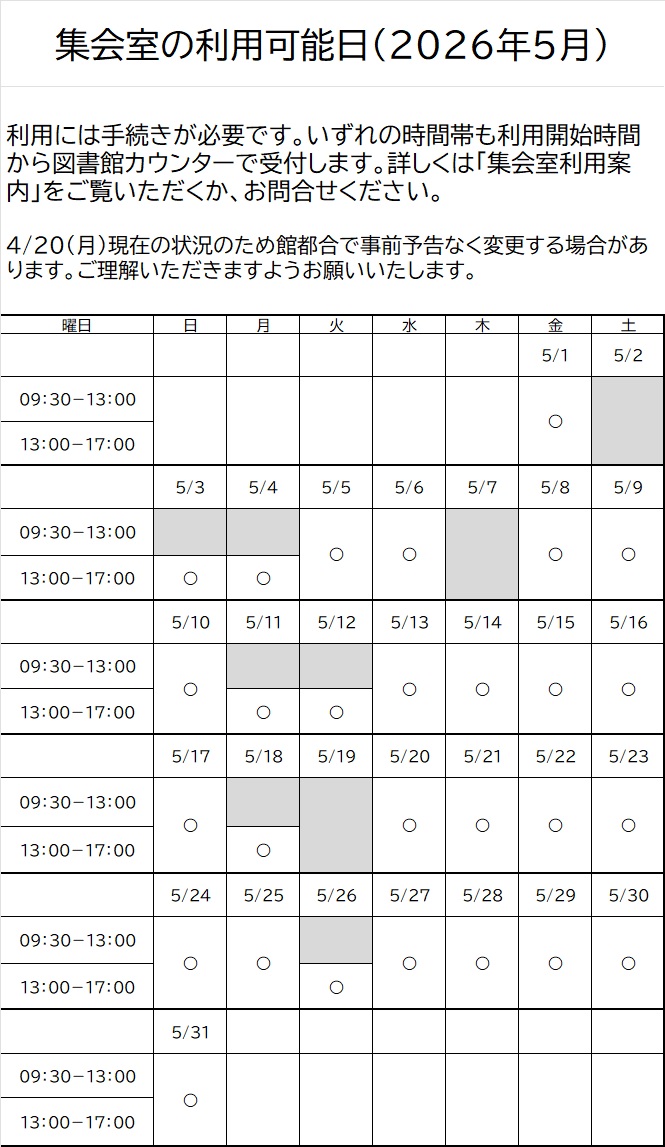 5月の集会室開放日について 2026/04/20 図書館2階の集会室を開放しています。読書や自習等にご利用ください。利用には図書館カウンターでの手続きが必要です。4月より利用時間が変更となります。終日利用可能な日は1回の申込で利用できます。詳しくは図書館窓口までお問い合せください。