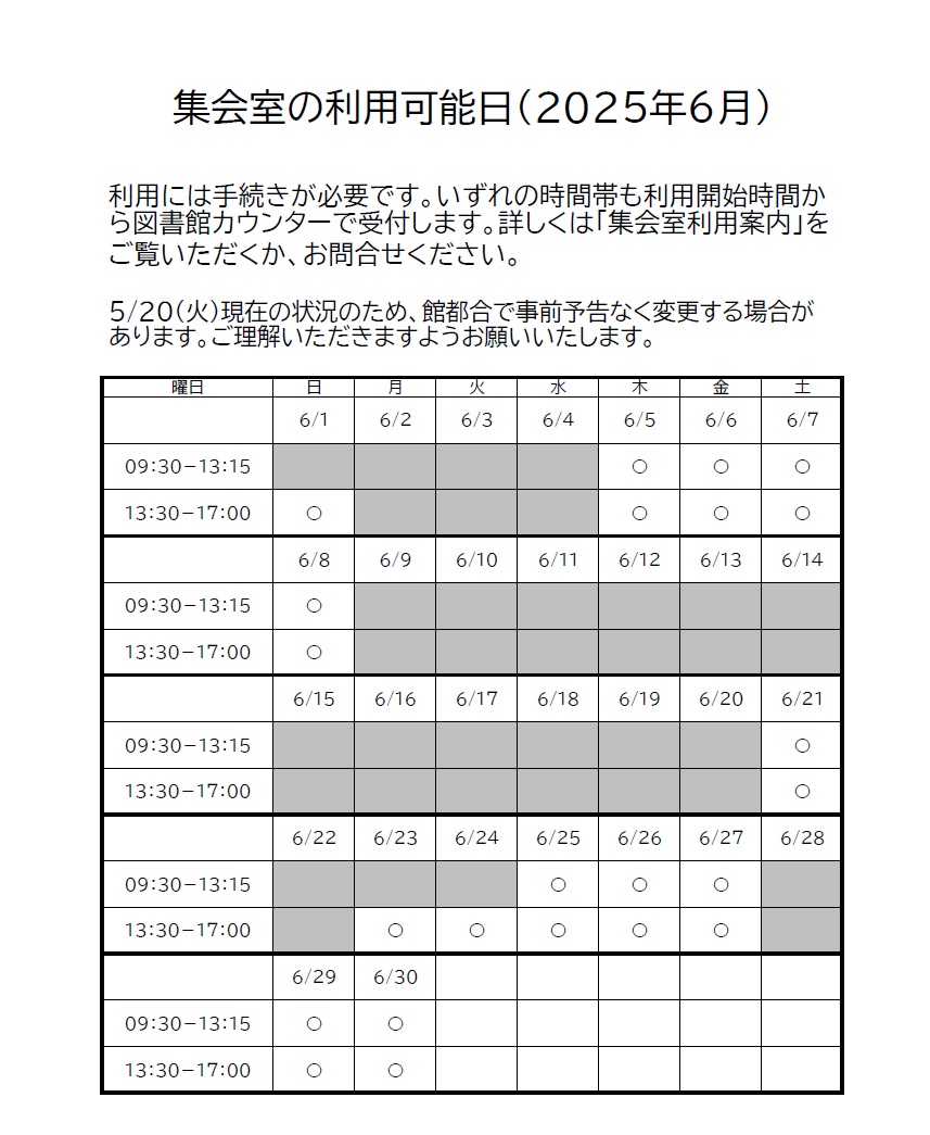 6月の集会室開放について 2025/05/23 図書館2階の集会室を開放しています。読書や自習等にご利用ください。利用には図書館カウンターでの手続きが必要です。詳しくは図書館窓口までお問い合せください。