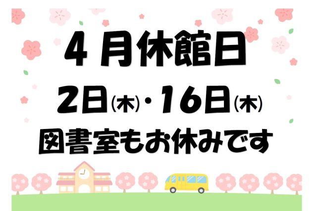 4月休館日のお知らせです 2日・16日第1・3木曜日はお休