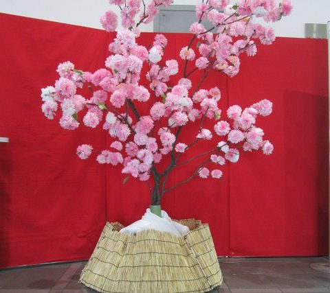 ただいま海洋文化センターの展示室の入口に、スタッフ手作りの桜の木を展示し