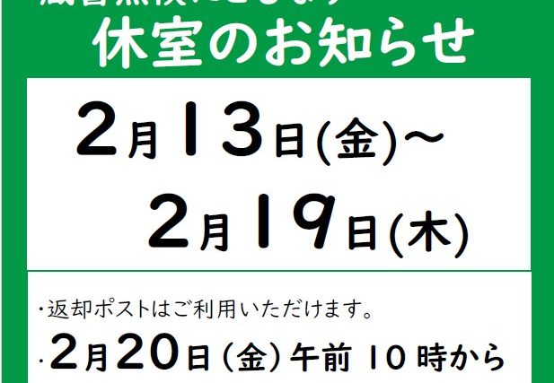 2月13日(金)~2月19日(木)まで 蔵書点検にともない休室となっております。 ご不便をおかけしま