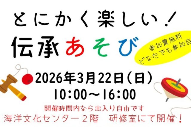 3月22日(日)10時から16時に「伝承あそび倶楽部」を開催します。 開催時間中の出入りは自由となっ
