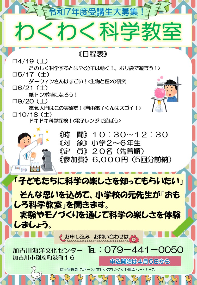 令和7年度わくわく科学教室参加者募集のお知らせ 2025/03/30 4月5日(土)10時よりわくわく科学教室、前期教室(5回)の参加者を募集いたします。 教室の開催時間は10時30分から12時30分です。 皆さんのご参加をお待ちしています。