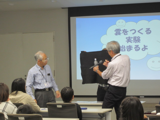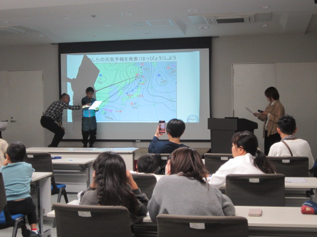 「親子お天気教室」開催しました。 2024/11/18 「親子お天気教室」を開催しました。 本物の気象予報士さん3名にきていただき、雲をつくる実験の他、お天気や自然について学んだあと、 最後はみんなで気象予報士になって明日の各地の天気予報を発表してもらいました。 皆の予報は当たったかな?