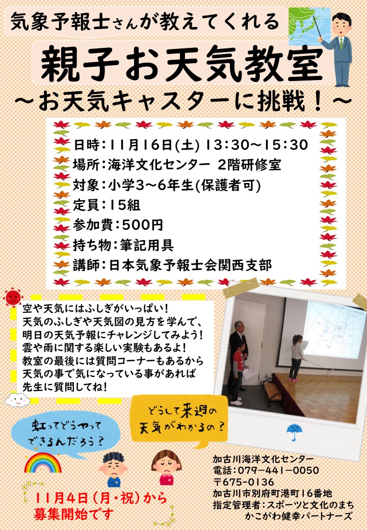 「親子お天気教室」開催のお知らせ 2024/10/20 「気象予報士さんが教えてくれる 親子お天気教室」開催のお知らせです。 気象予報士さんと一緒に、お天気に関する実験(雲を作る実験、気圧が分かる実験、雨粒の形を見てみる)や天気図の見方を教わった後、チームに分かれてお天気キャスターに挑戦してもらいます。 募集受付は11月4日(月・祝)10時からです。 皆様のご参加をお待ちしております。