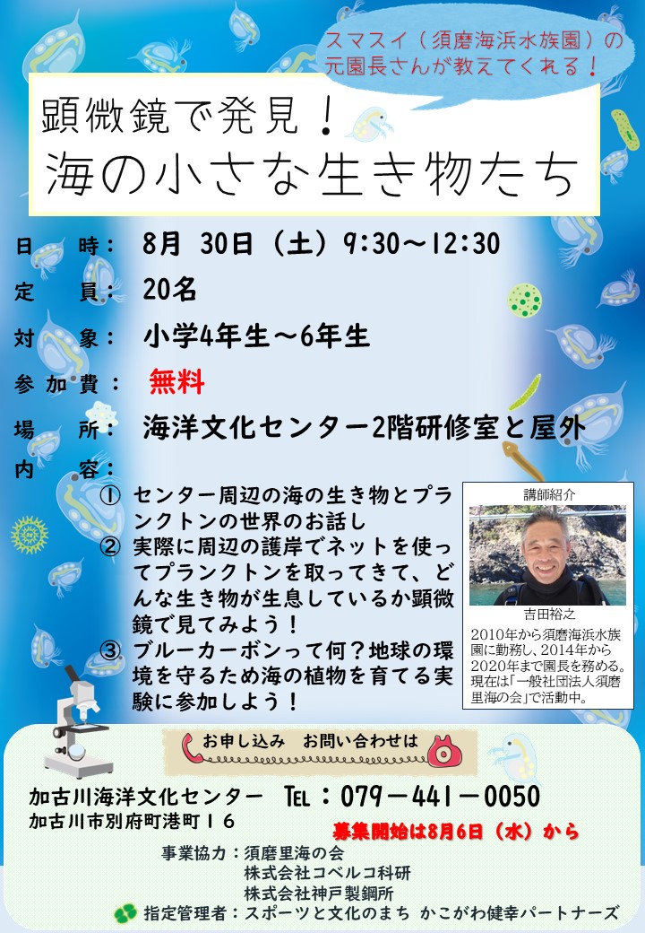 【参加者受付中】「顕微鏡で発見!海の小さな生き物たち」開催のお知らせ 2025/08/22 「顕微鏡で発見!海の小さな生き物たち」開催のお知らせです。 須磨海浜水族園の元園長さんによる、海の生き物やプランクトンについてのお話しの後、実際にセンター周辺の護岸からプランクトンを採取して顕微鏡で観察します。 その後、海の環境を守るための実験(海藻を育てる実験)のお話もあります。 参加費は無料。募集開始は8月6日(水)10時からとなります。 普段なかなか経験できない貴重な体験ができる機会になると思います。 皆様のご参加お待ちしております。