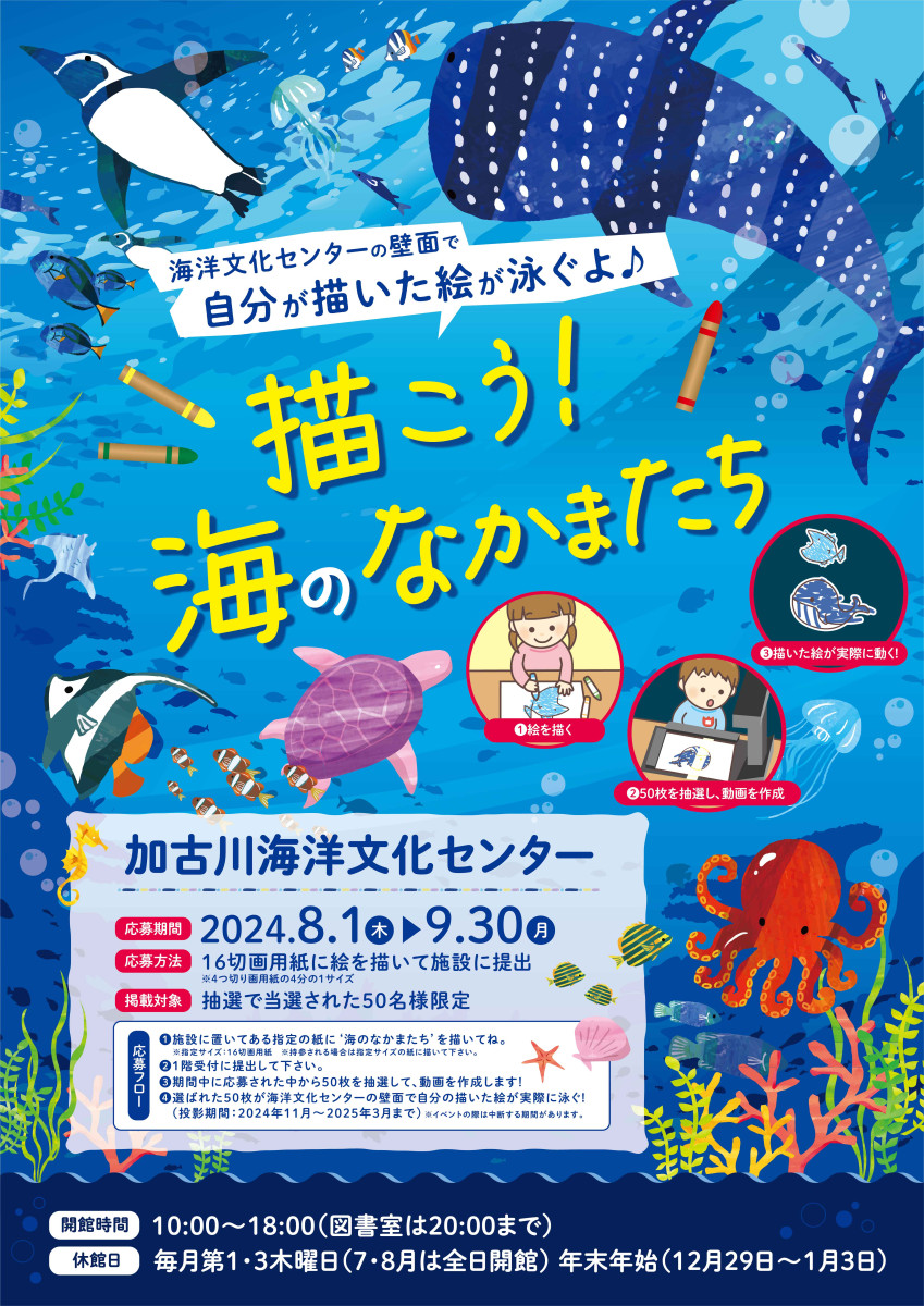 海洋文化センターでは、皆さんの創造力を集めた特別企画「描こう!海のなかまたち」を開催します。自分が描いた絵を切り抜いて、50人分の作品を一つの動画にまとめ、センター1階受付前の壁にプロジェクターで投影します。ぜひ、あなたの絵を応募して、一緒に素敵な海の世界を作りましょう!