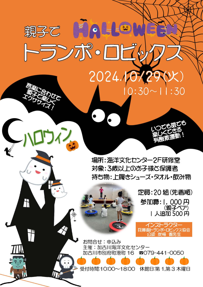 【参加者募集中】親子でトランポ・ロビックス ~ハロウィン特別編~ 2024/09/09 前回7月に開催し大好評だった【親子でトランポ・ロビックス】がハロウィン特別編として、2024年10月29日(火)に再び開催されます。 トランポリンで親子一緒に跳んだり、跳ねたりしながら、みんなで運動を楽しみましょう。 小さいお子様から大人まで、楽しみながら有酸素運動ができます。 応募は先着順となっておりますので、お早めに! みなさまのご参加お待ちしています