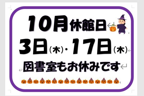 【10月休館日のお知らせ】 2024/10/21 10月休館日のお知らせです! 第1・3木曜日は休館日となります 図書室もお休みです。 また、10月26日(土)・27日(日)は臨時休館日となりますので お間違えのないようにお越しください