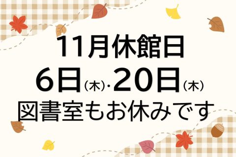 【11月の休館日のお知らせ】 2025/10/18 11月休館日のお知らせです 6日・20日の第1・3木曜日は休館日となります 図書室もお休みですので、お間違えの無いようにお越しください 皆様のお越しをお待ちしております