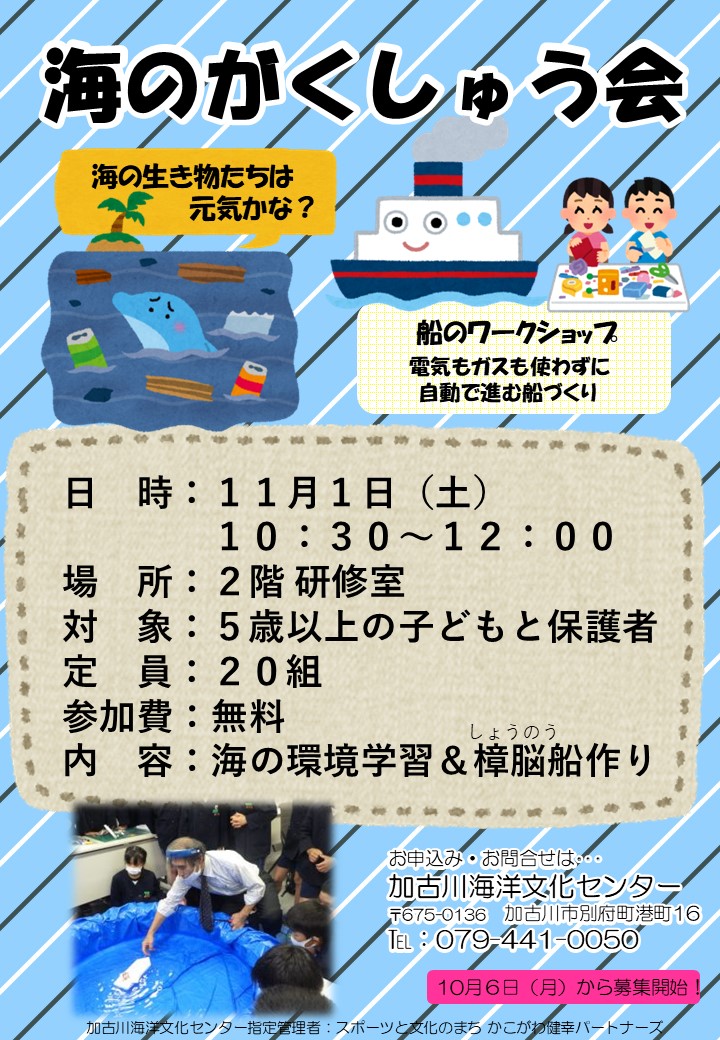 11月1日のイベント、海のがくしゅう会は親子20組の募集となります。