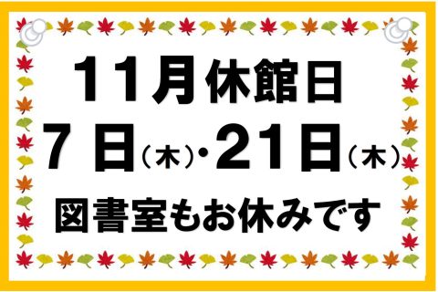 【11月休館日のお知らせ】 2024/10/30 朝晩と寒くなってきましたが、体調崩されてませんか? 11月の休館日のお知らせです! 第1・3木曜日は休館日となります。図書室もお休みになりますので お間違えの無いようにお越しください