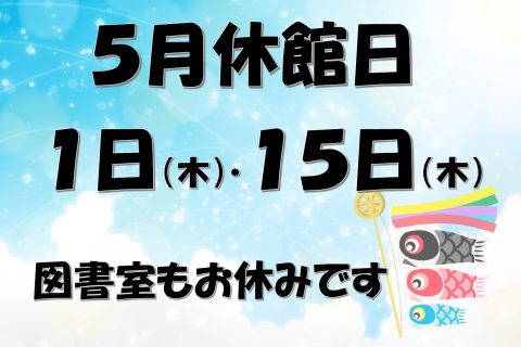 【5月休館日のお知らせ】 2025/04/22 5月休館日のお知らせです🎏 第1・3木曜日は休館日となります。 1日(木)・15日(木)お休みです。 図書室もお休みですのでお間違えの無いようにお越しください。