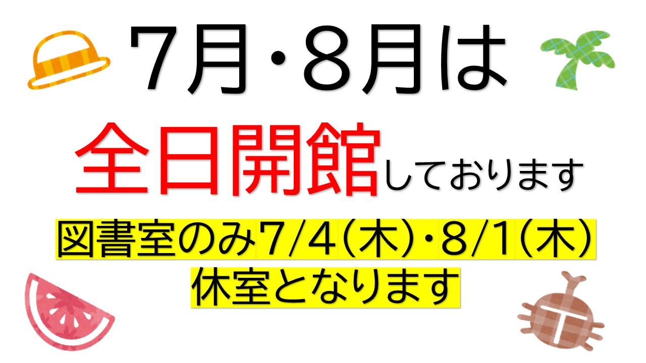 【7月・8月休館日のお知らせ】 2024/07/02 7月・8月の休館日のお知らせです。 7月・8月は全日開館しております。図書室のみ7/4(木)・8/1日(木)がお休みとなりますので お間違えのないように、お越しください