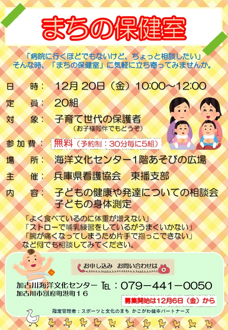 まちの保健室開催します。 2024/12/01 12月20日(金)10時から12時に「まちの保健室」を開催します。 「病院に行くほどでもないけど、ちょっと相談したい」 そんな時、「まちの保健室」に気軽に立ち寄ってみませんか。 「よく食べているのに体重が増えない」 「ストローで哺乳練習をしているがうまくいかない」 「腕が痛くなってしまうため片手で抱っこできない」 など何でも相談してみてください。