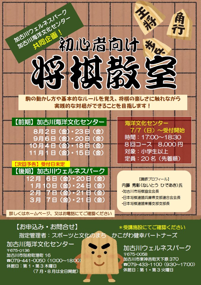 初心者向け将棋教室 参加者募集中 2024/07/05 加古川は将棋が盛んな地域で、『将棋の町』ですね 海洋文化センターでは初心者向け将棋教室を開催します。 将棋を初めてみようと思っている方、この機会に参加してみませんか? みなさまのご参加をお待ちしています