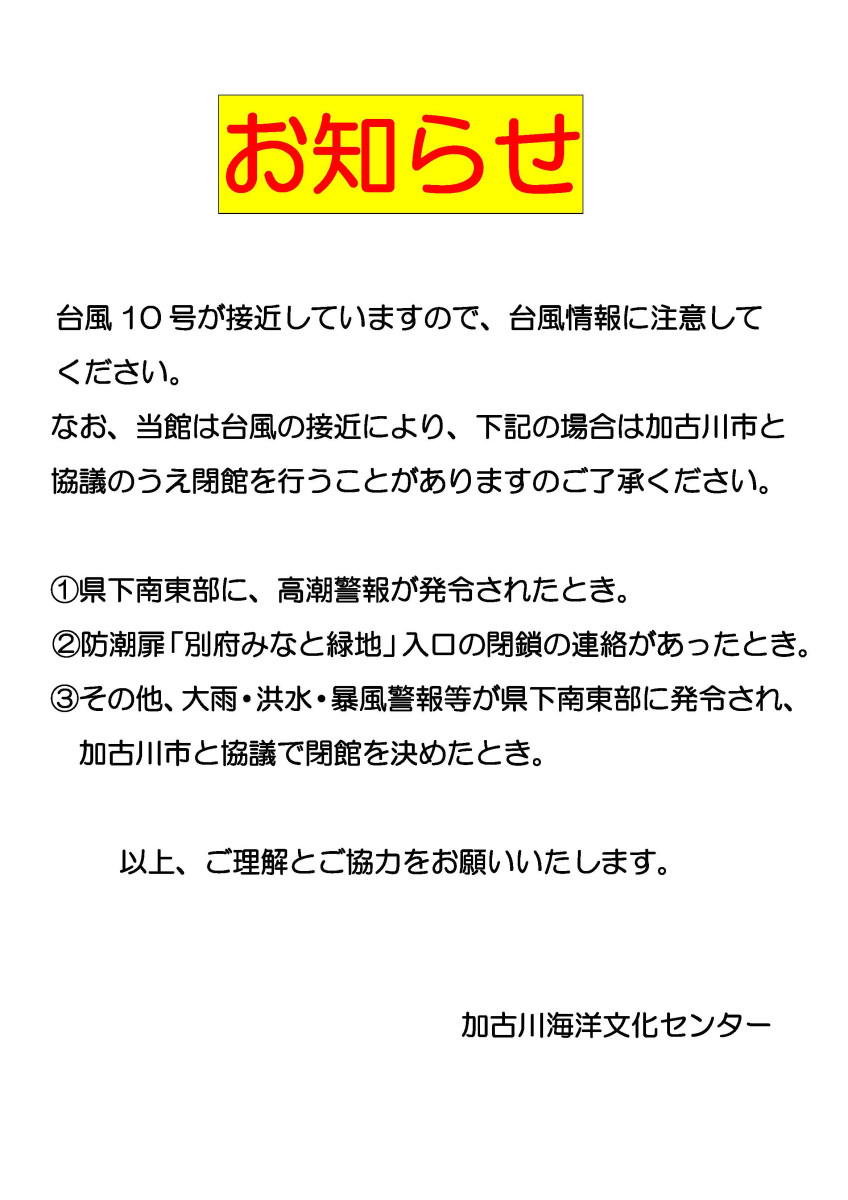 台風による臨時閉館・開館時間変更の可能性について 2024/08/27 台風10号の発生にともない、当センターは臨時閉館や開館時間の変更を行う可能性があります。 下記の基準に従いように臨時閉館や開館時間変更を行いますので、利用者の皆様方はニュース等で気象情報を把握の上、ご来館ください。