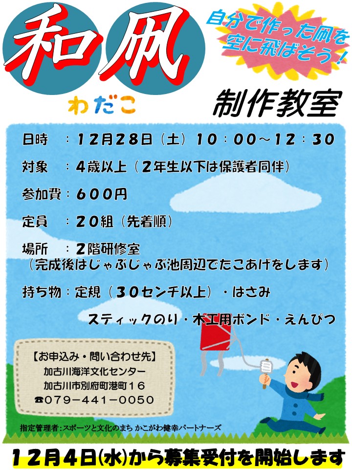 和凧制作教室開催します。 2024/12/01 12月28日(土)10時から「和凧制作教室」を開催します。 自分で作った凧を大空へ飛ばしてみませんか? 募集開始は12月4日(水)からです。 皆さんのご応募お待ちしております。