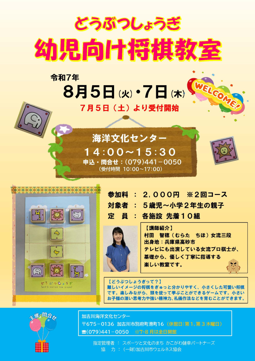 幼児向けの将棋教室(どうぶつしょうぎ)を開催します! 2025/07/26 難しいイメージの将棋をお子様向けにぎゅっとわかりやすく、かわいい絵柄の駒を使った「どうぶつしょうぎ」。楽しみながらも頭を使って遊ぶので、お子様の深い思考力や強い精神力、礼儀作法なども学べます。お子様と一緒に「どうぶつしょうぎ」を体験してみませんか? お申し込みは2025年7月5日(土)から。 お詫び:広報かこがわの記載が間違っておりました。正しくは以下となります。 誤:8月4日(月)と8月7日(木) 正:8月5日(火)と8月7日(木)
