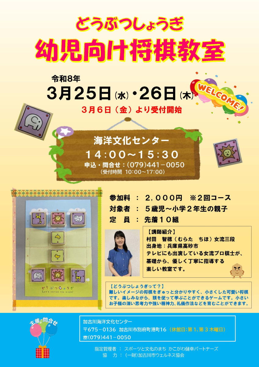 幼児向け将棋教室(どうぶつしょうぎ)開催のお知らせ 2026/03/04 3月25日(水)、26日(木)の2日間で「幼児向け将棋教室(どうぶつしょうぎ)」を開催します。 村田智穂 女流三段を講師に迎え、初めてのお子様にもわかりやすく教えていただけます。 皆さんのご参加をお待ちしております。