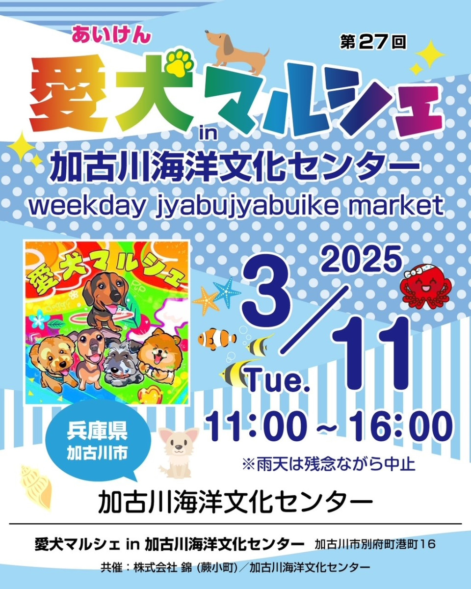 【予定通り開催します】愛犬マルシェ in 加古川海洋文化センターのお知らせ 2025/03/11 2025年3月11日(火)11時よりペットイベント「愛犬マルシェ in 加古川海洋文化センター」を開催します。 愛犬マルシェはワンちゃんのグッズ・おやつの販売や気になる身体のメンテナンスや物販のほか、キッチンカー、更に保護犬譲渡会なども実施いたします。 会場の加古川海洋文化センターには110台分の無料駐車場もあります。 皆さん是非お越しくださいませ。 ※3月11日(火)9時現在少し雨が降っていますが、この後雨が止む予報となっていますので、愛犬マルシェは予定通り開催します。