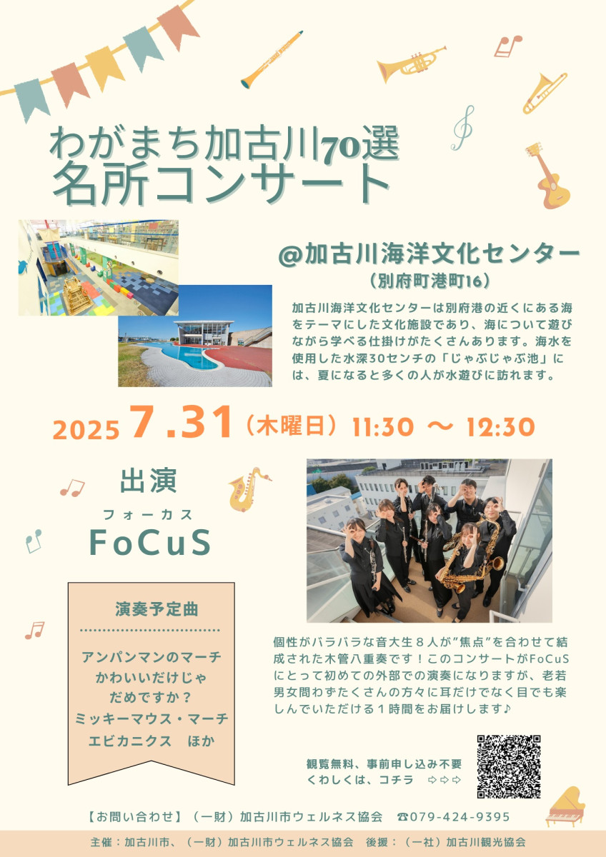 2025年7月31日(木)11時30分から、海洋文化センターで「わがまち加古川70選 名所コンサート」が開催されます。
