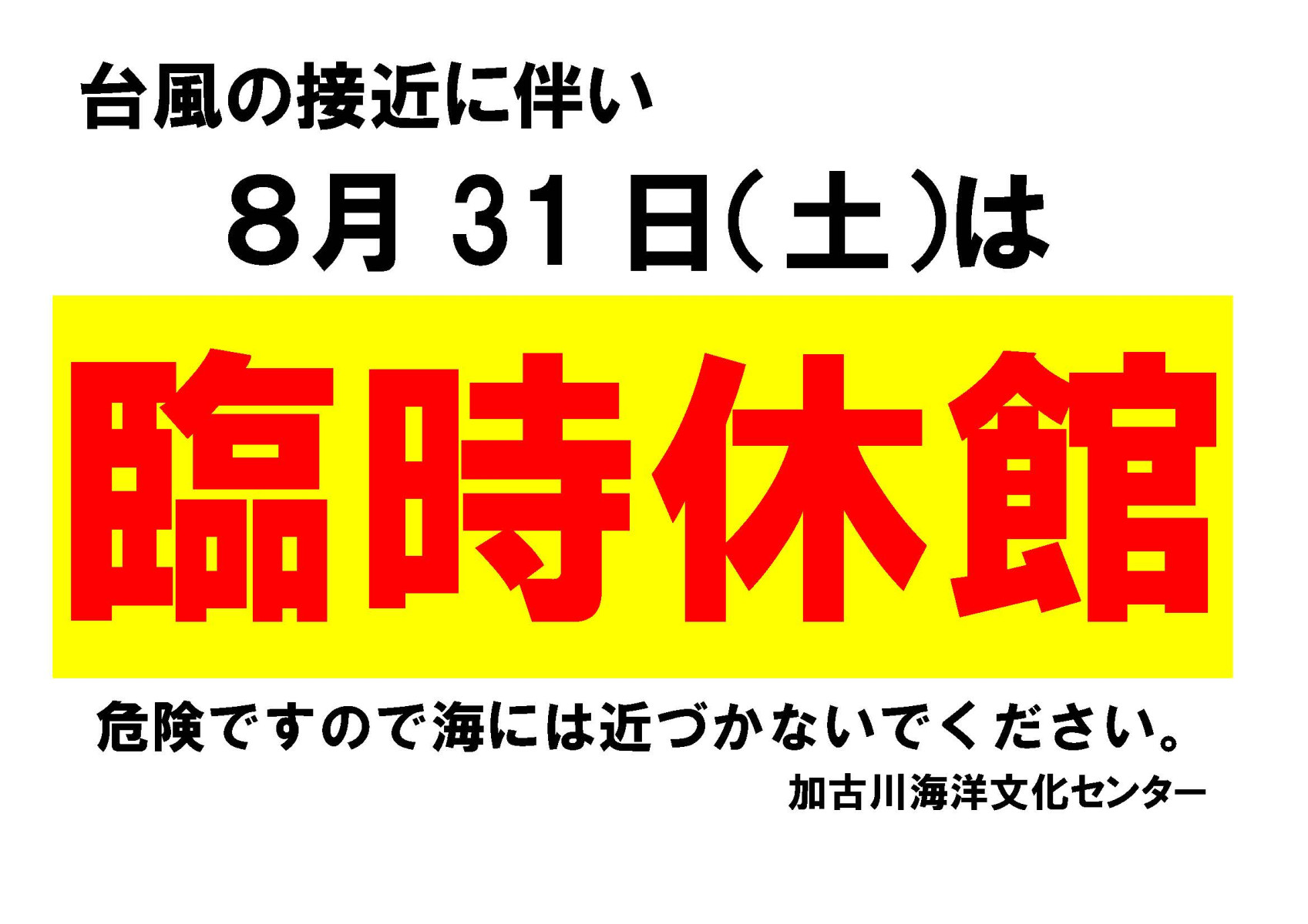 臨時休館のお知らせ 2024/08/30 平素より、加古川海洋文化センターをご利用いただき誠にありがとうございます。 台風10号の接近に伴い8月31日(土)は臨時休館とさせていただきます。 なお、9月1日(日)の開館可否は改めてホームページでお知らせいたしますのでご確認願います。