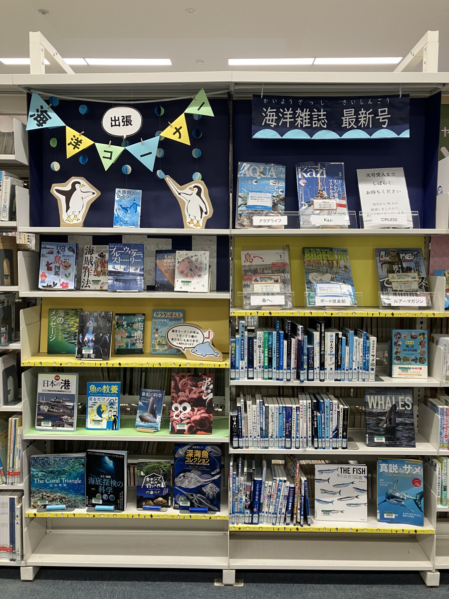 海が見られる奥のほうにある海洋コーナーにも海に関する本や雑誌のバックナンバーが