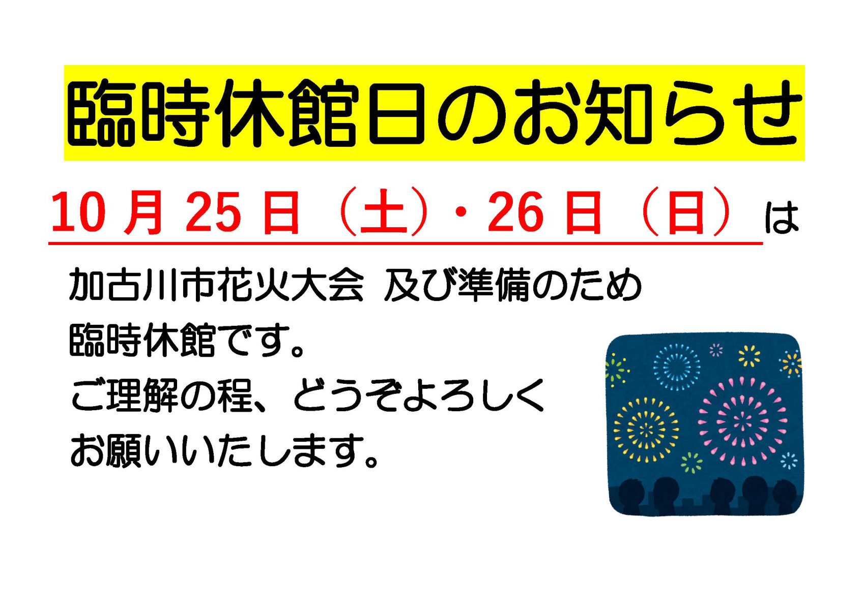 10月25日(土)・26日(日)臨時休館のお知らせ 2025/10/05 10月25日(土)・26日(日)は加古川市花火大会及び準備のため臨時休館となります。 ご理解の程、どうぞよろしくお願いいたします。