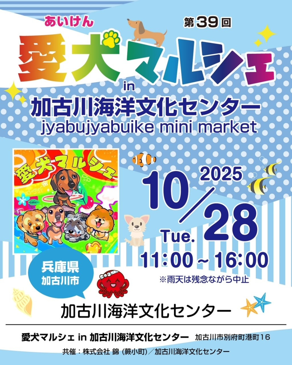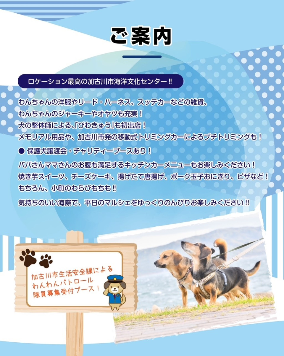 10月28日(火)愛犬マルシェin海洋文化センター開催のご案内 2025/10/17 10月28日(火)に海洋文化センターにて愛犬マルシェを開催します。 愛犬グッズ販売の他、保護犬譲渡会、キッチンカー出展など様々なイベントもあります。 どうぞ気軽にお立ち寄りください。