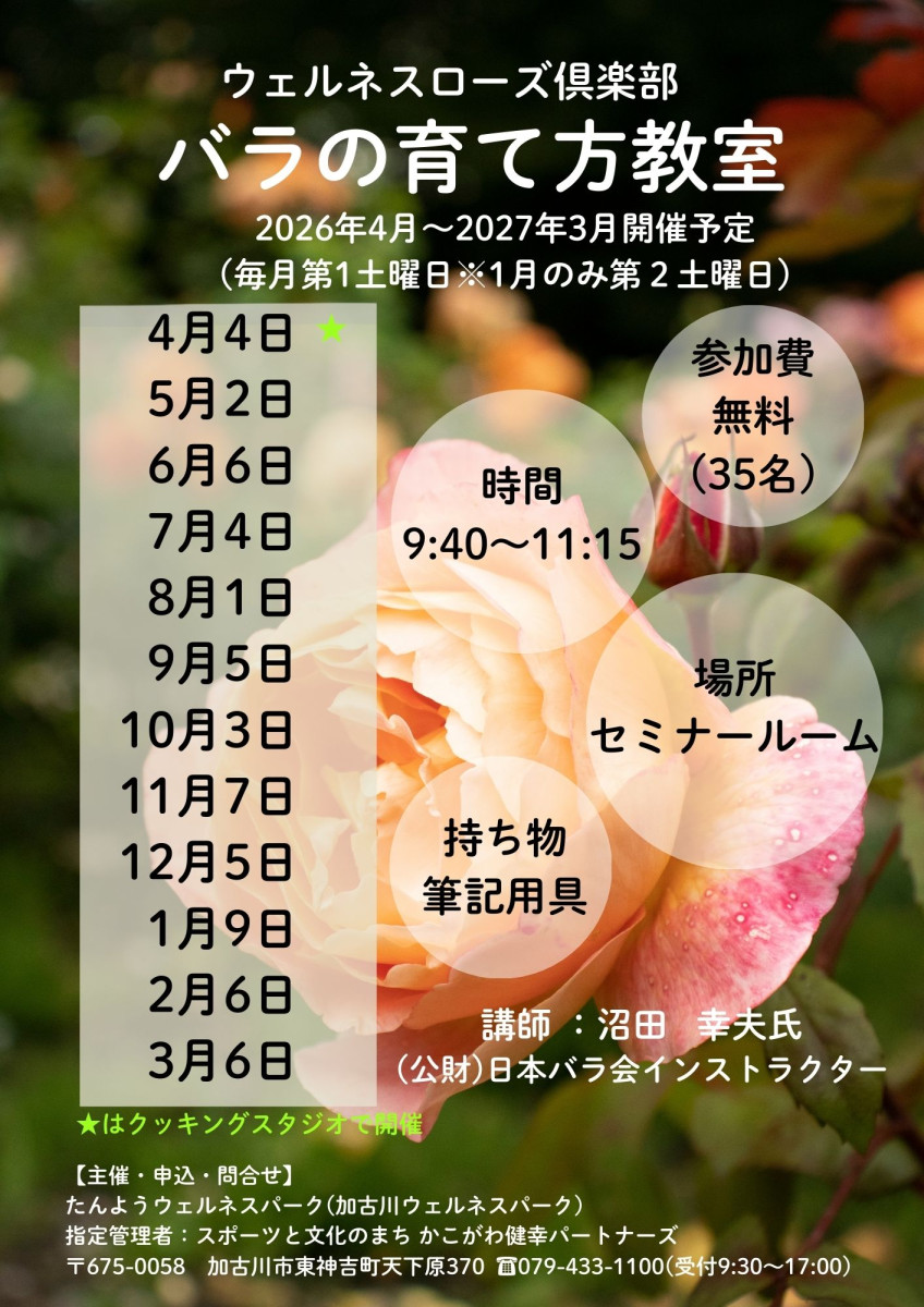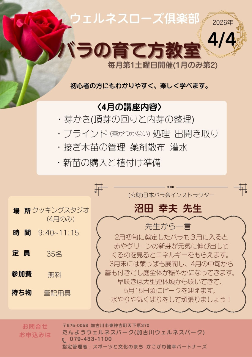 ウェルネスローズ俱楽部 2026/03/01 ウェルネスローズ俱楽部 バラの育て方教室たんようウェルネスパーク日程2026-04-04 (土)時間09:40~11:15場所クッキングスタジオ価格参加費 無料詳細 >