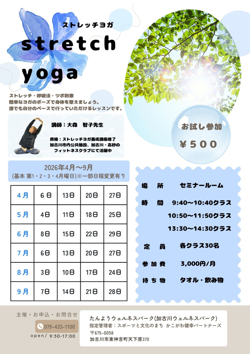 ストレッチヨガ 2026/03/01 ストレッチヨガたんようウェルネスパーク日程2026-04-06 (月)時間①9:40クラス09:40~10:40➁10:50クラス10:50~11:50➂13:30クラス13:30~14:30価格月謝¥3,000詳細 >