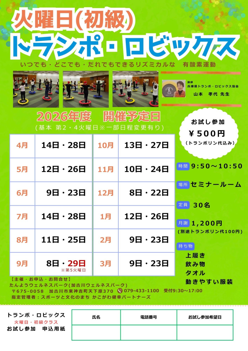 トランポ・ロビックス 火曜日クラス 2026/03/18 トランポ・ロビックス 火曜日初級クラスたんようウェルネスパーク日程2026-05-26 (火)時間初級クラス09:50~10:50場所セミナールーム価格月謝¥1,200詳細 >